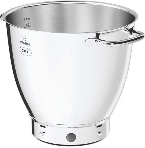 Integrierte Wiegefunktion (1 g – 6 kg); EASYWARM-Funktion; 2 Schüsseln (7 l – 5 l); Schüsselbeleuchtung (LED); 6 voreingestellte Programme (in einem Schritt); Edelstahl-Gebäckset (Kneter, Schneebesen, Rührbesen und flexibler Rührbesen); Unterstütztes Öffnen des Roboterkopfes; Planetenbewegung; Spritzwassergeschützte Abdeckung; Garantiert 0 % Bisphenol